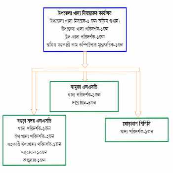 অফিস প্রধানের পদবি- উপজেলা খাদ্য নিয়ন্ত্রক, তাঁকে সহায়তা করার জন্য রয়েছে ০১ (এক) জন খাদ্য পরিদর্শক, ০১ (এক) জন